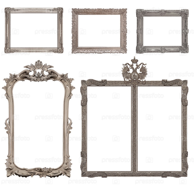 Набор серебряных рамок для картин, зеркал или фотографий, изолированных на белом фоне