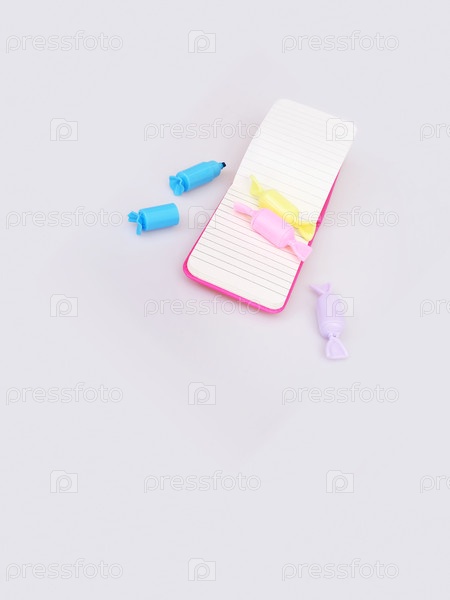 Композиция (мокап) с розовым блокнотом и многоцветными маркерами, подчеркнутыми на белом фоне