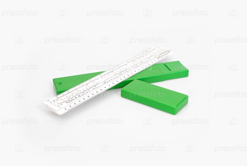 Типичное студенческое слайд-правило в зеленой коробке, изолированной на белом фоне