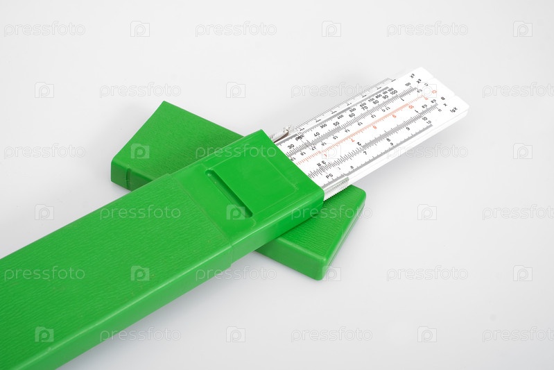 Типичное студенческое слайд-правило в зеленой коробке, изолированной на белом фоне