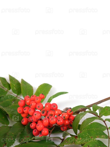 Ветвь горного пепла с ярко-красными ягодами и зелеными листьями изолирована на белом фоне для дизайна плаката или поздравительной открытки