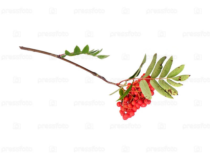 Ветвь с ярко-красными ягодами пепла и зелеными листьями изолирована на белом фоне, вырез шеи готов
