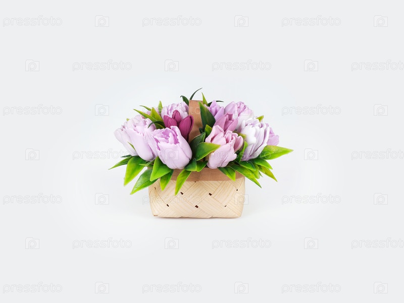 Шаблон приветственной карточки.Тюльпановая корзина, изолированная на белом фоне