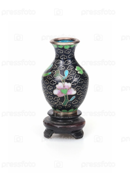 Традиционная китайская металлическая ваза, украшенная многоцветной эмалью (клозон), изолированная на белом фоне