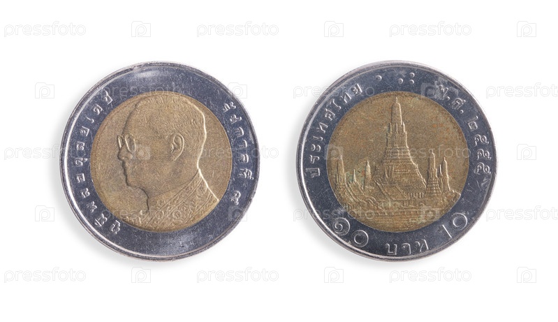 Тайская монета номиналом 10 бат (обратная сторона и лицевая часть) выделена на белом фоне.Тайская надпись по-английски означает Король Бумибол Адульядеш. 10 бат. Храм рассвета. Элемент дизайна с подстриженной дорожкой