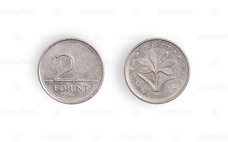 Венгерская монета 2 форинта (обратная и обратная сторона). венгерская надпись 'Венгерская Республика' на английском языке. элемент дизайна с обрезанной дорожкой