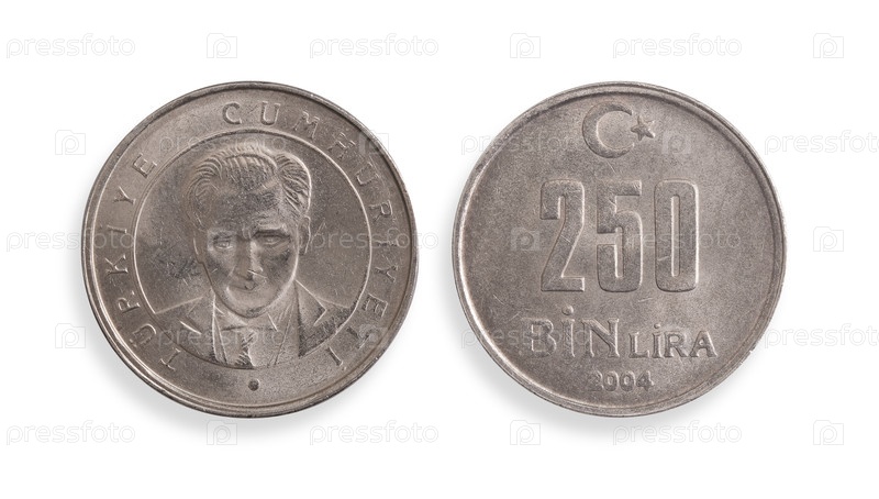 Турецкая монета 250 000 турецких лир (две стороны) Турецкая надпись на английском языке означает 'Республика Турция'. 250.000 лир