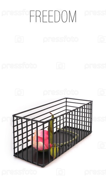 Символическая композиция: розовый цветок в металлической вазе, выделенная на белом фоне