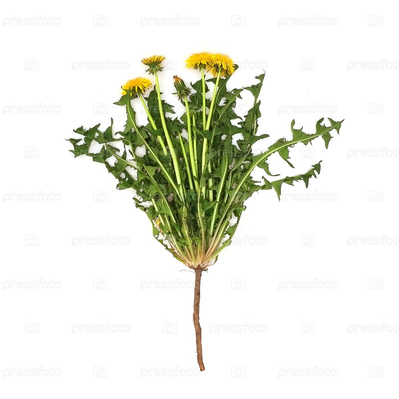 Желтые одуванчики с корнем, изолированные на белом фоне