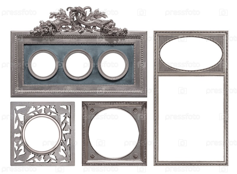 Набор серебряных рамок для картин, зеркал или фотографий, изолированных на белом фоне
