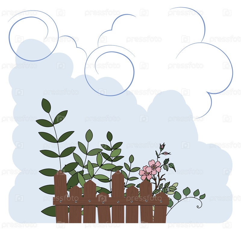 Зеленые растения и цветы за деревянным забором
