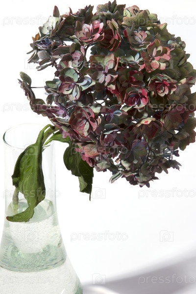Цветки гортензии в стеклянной вазе, изолированной на белом фоне