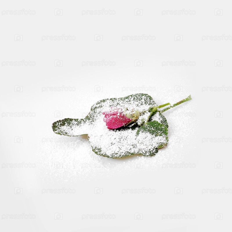 Розовый цветок и зеленый лист в снегу изолированы на белом фоне