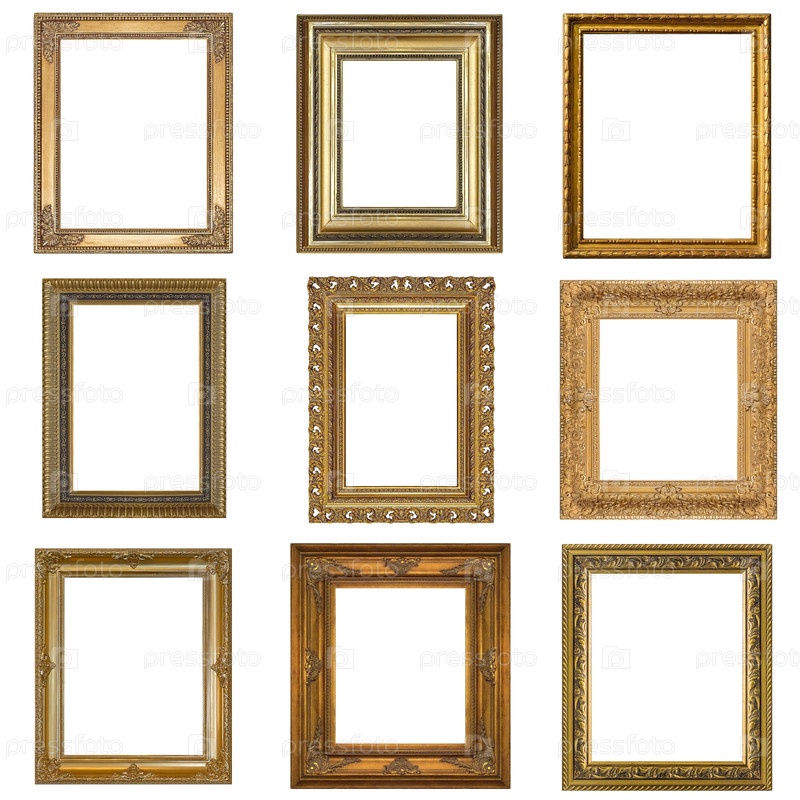 Набор золотых рамок для картин, зеркал или фотографий, изолированных на белом фоне