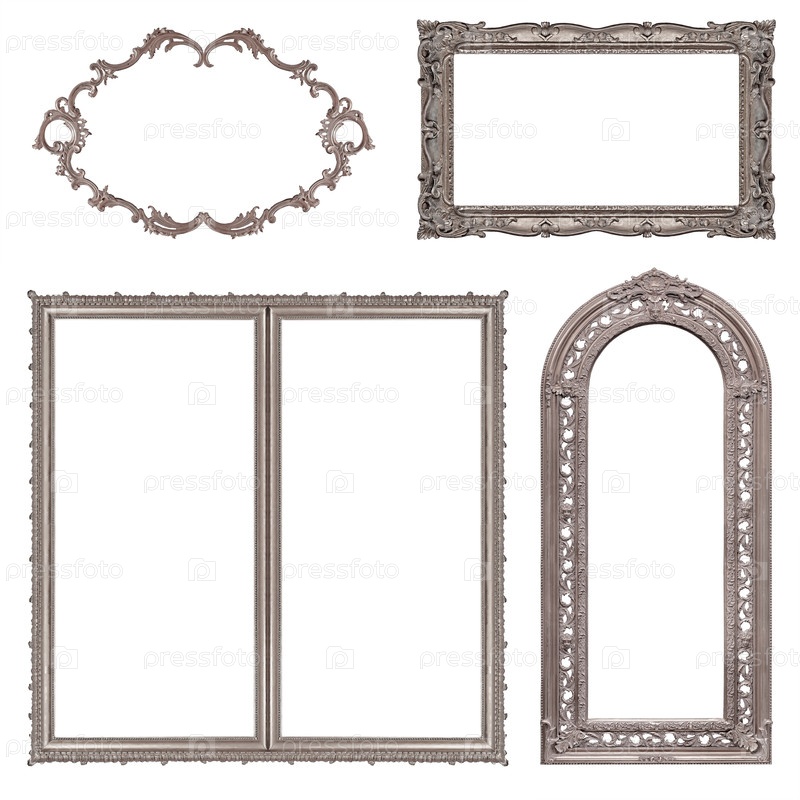 Набор серебряных рамок для картин, зеркал или фотографий, изолированных на белом фоне