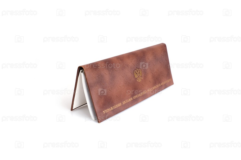 Дневник в коричневой кожаной обложке изолирован на белом фоне. Надпись на русском языке 'Директория Президента Российской Федерации'