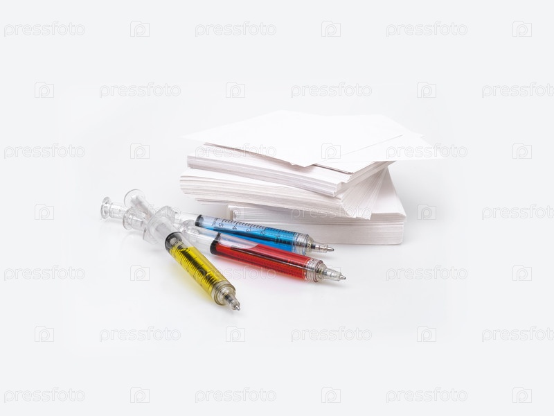 шариковые ручки в виде медицинского шприца и стек белой бумаги изолированы на белом фоне