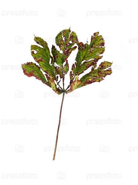 Изолированный поврежденный листок каштана с коричневыми пятнами на белом фоне, отрезка готова