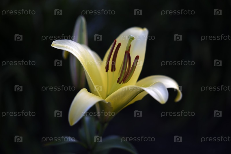 Светло-желтый цвет лилии на темном фоне. светлый цветок в темном саду. лилия