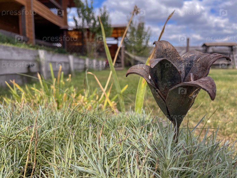 Ручной работы красный цветок из железного металла, установленный в загородном доме
