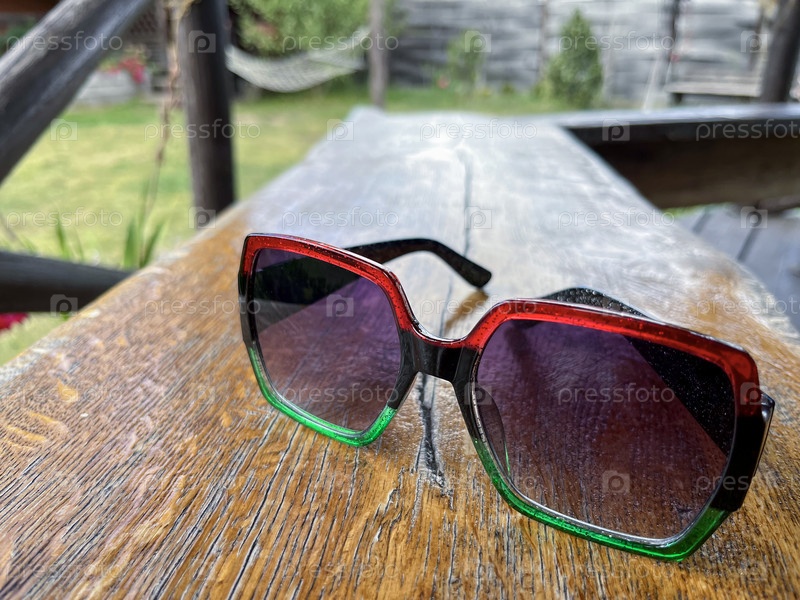 Летом солнцезащитные очки лежат на скамейке в деревне