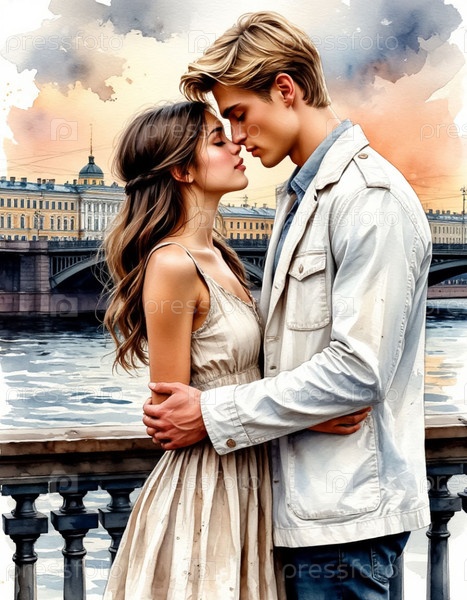 Моряк обнимает красивую девушку на городской акварельной АРТ
