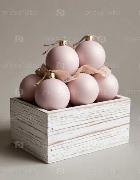 Новогодние розовые пастельные шары, украшенные винтажными кружевами в белокрасочной деревянной коробке