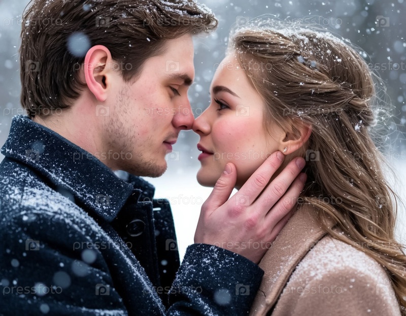 Молодая пара мужчин и женщин целуются на улице зимой
