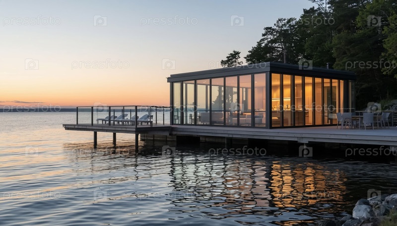 Современный модульный дом с панорамными окнами и непрерывным остеклением на берегу озера