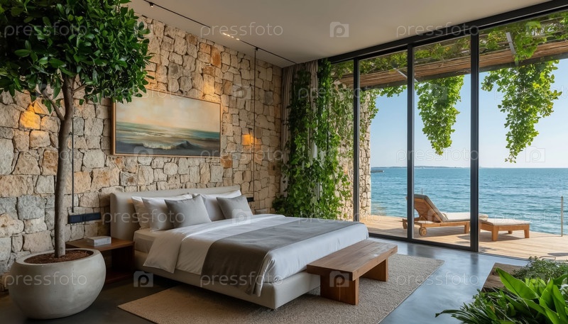 Роскошный интерьер спальни с панорамными окнами на море