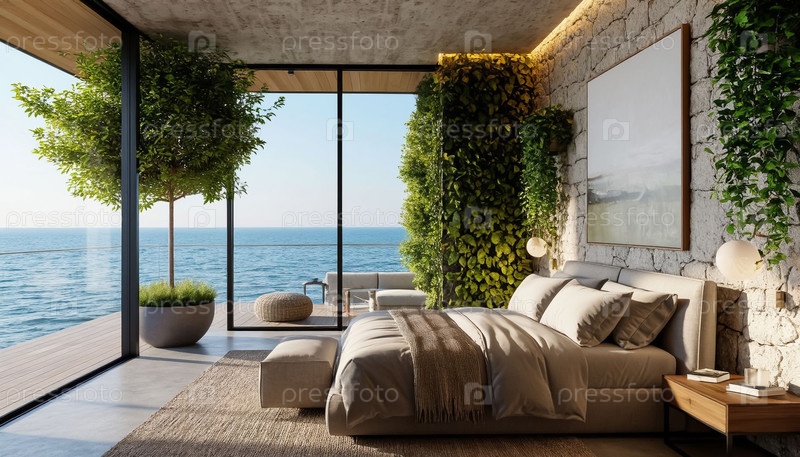 Роскошный дом у моря - спальня и терраса с выходом на воду. загородный отель. генерация ИИ