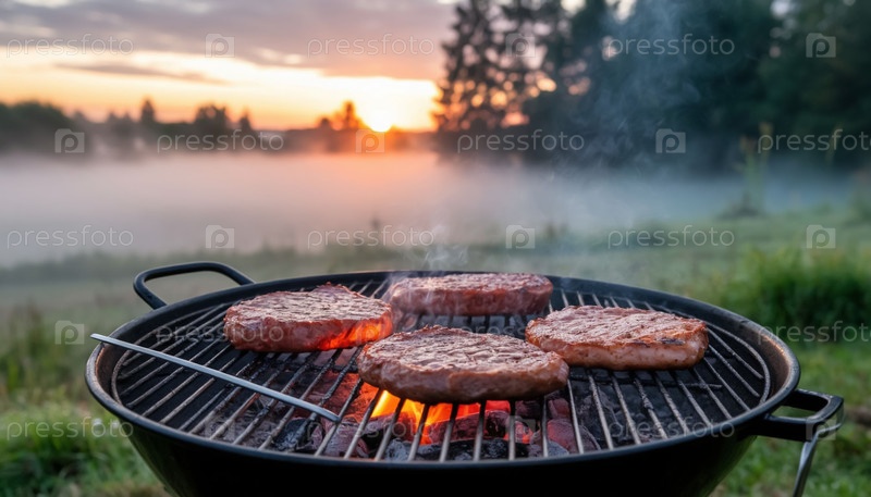 Закрытие барбекю на закате в туманном поле