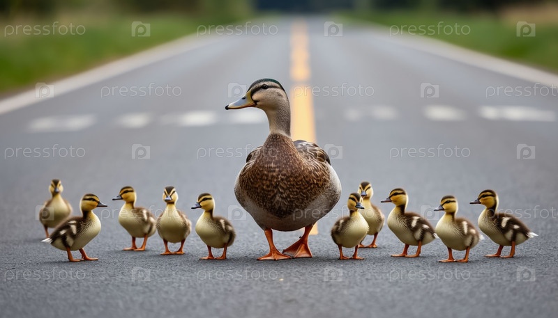 Утка с утеночками пересекает дорогу