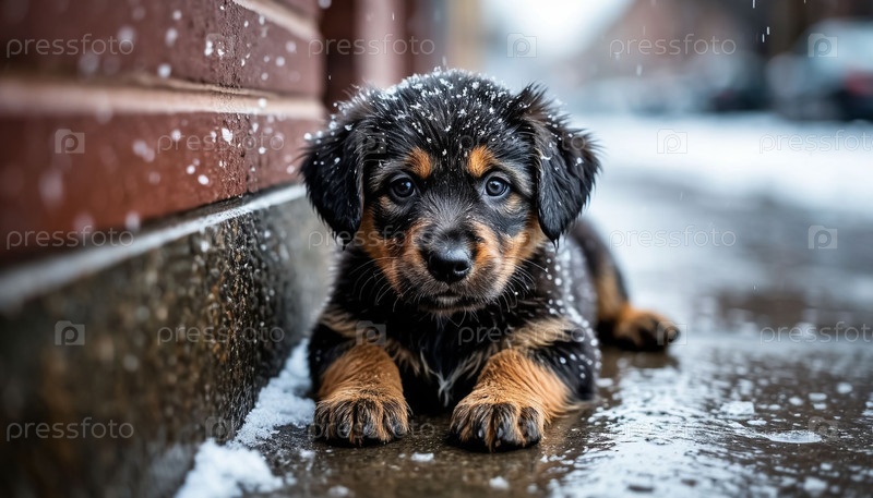 Бездомного щенка и первый снег в городе
