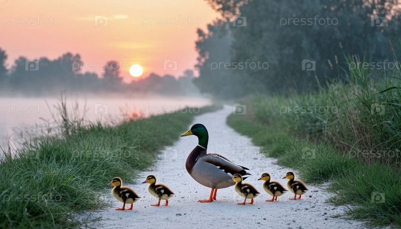 Утки ходят по тропинке в поле на рассвете
