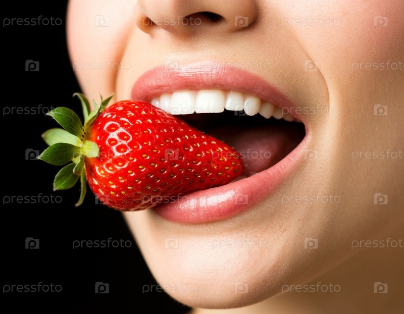 В губах женщины сочные клубники