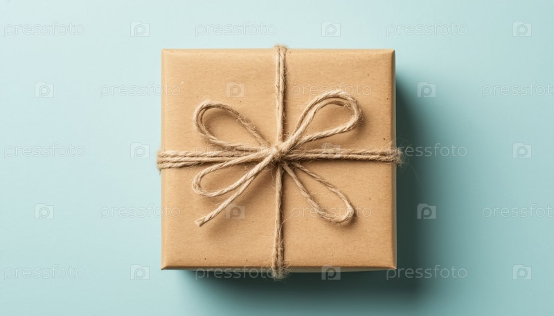Подарок в крафт-бумаге на пастельно-синем фоне