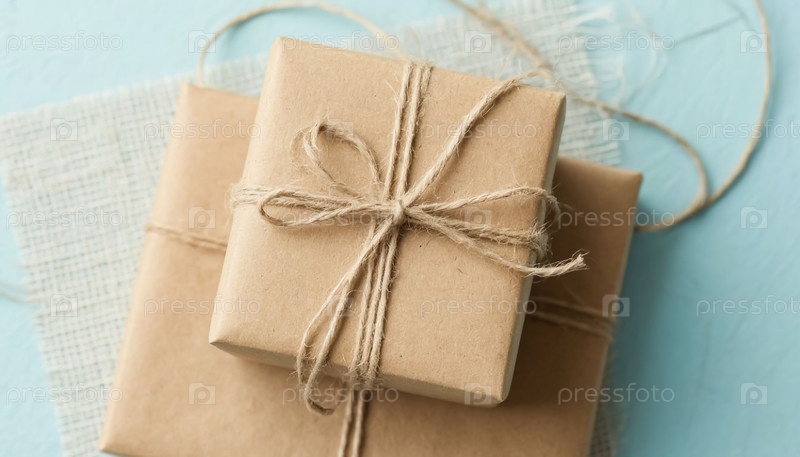 Подарок в крафт-бумаге на пастельно-синем фоне