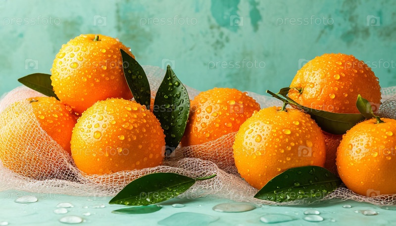 Апельсины в сетке на голубом пастельном фоне
