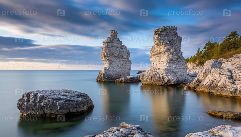 Нежный ландшафт Молре с высокими белыми скалами, выступающими из воды