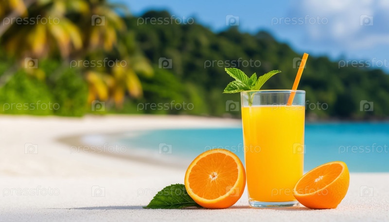 Оранжевый свежий напиток на пляже с белым песком