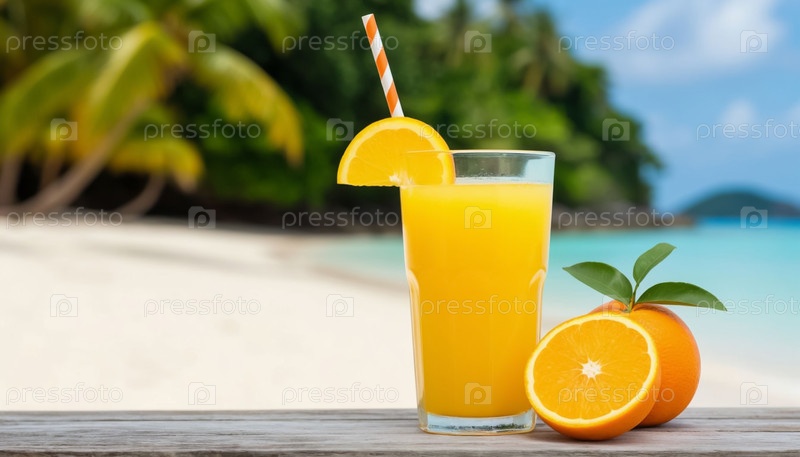 Оранжевый свежий напиток на пляже с белым песком