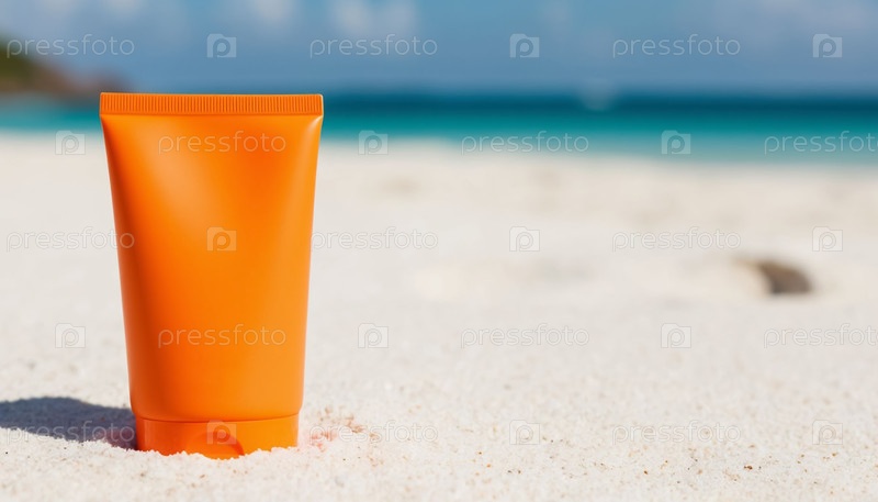 Солнцезащитный крем желтый на морском пляже с белым песком