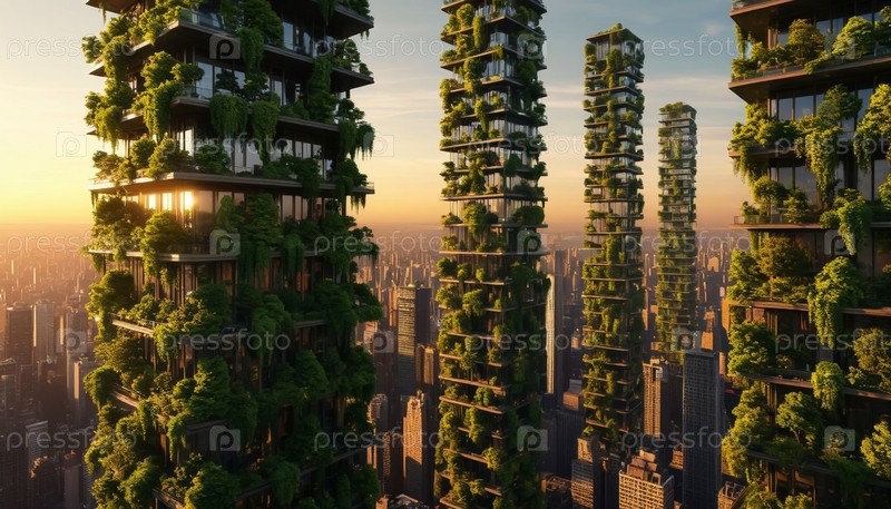 Будущий мегаполис с плавающими эко-небоскребами, покрытыми вертикальными лесами