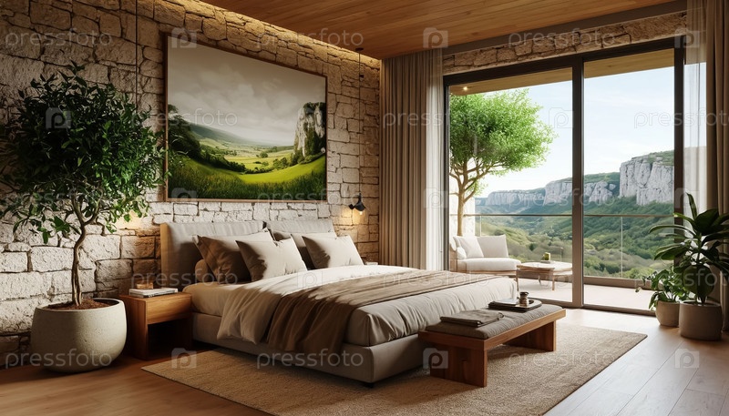Роскошная гостиничная спальня в горах, панорамное окно