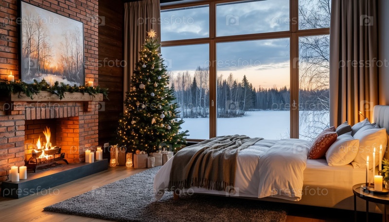 Интерьер спальни загородного коттеджа с панорамным окном и украшенной рождественской елкой