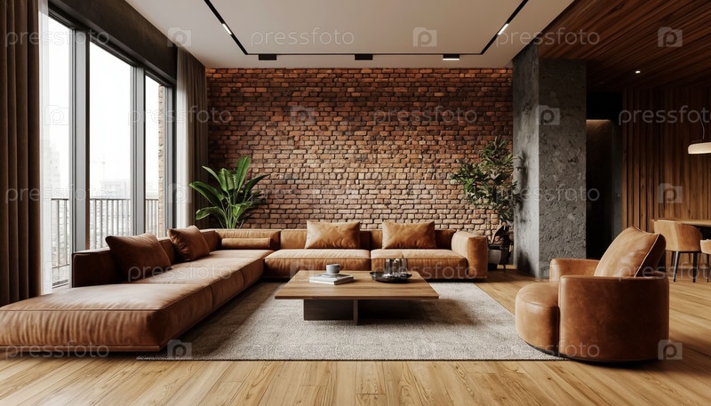 Современная гостиная, кирпичные стены, удобные диваны с подушками, панорамные окна. загородный коттедж, отель. генерация ИИ