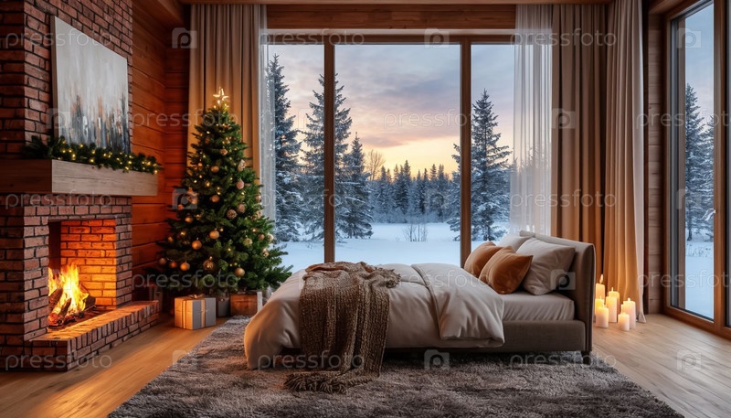 Интерьер спальни загородного коттеджа с панорамным окном и украшенной рождественской елкой
