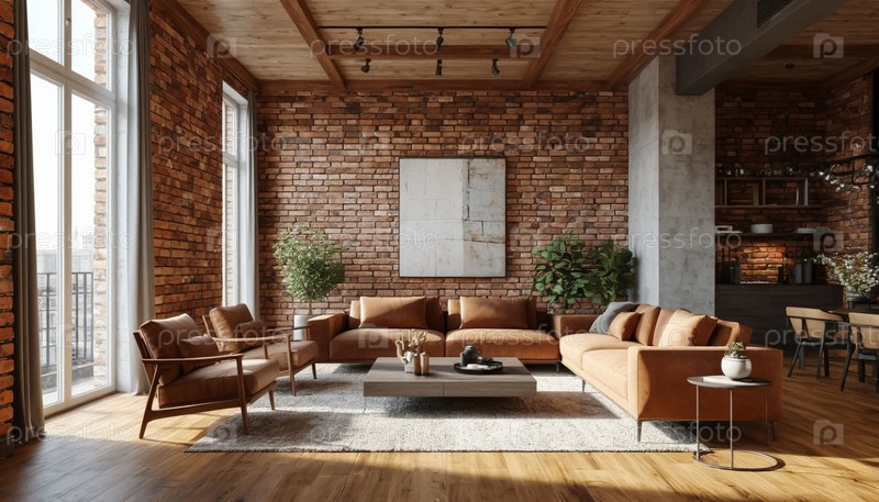 Современная гостиная, кирпичные стены, удобные диваны с подушками, панорамные окна. загородный коттедж, отель. генерация ИИ