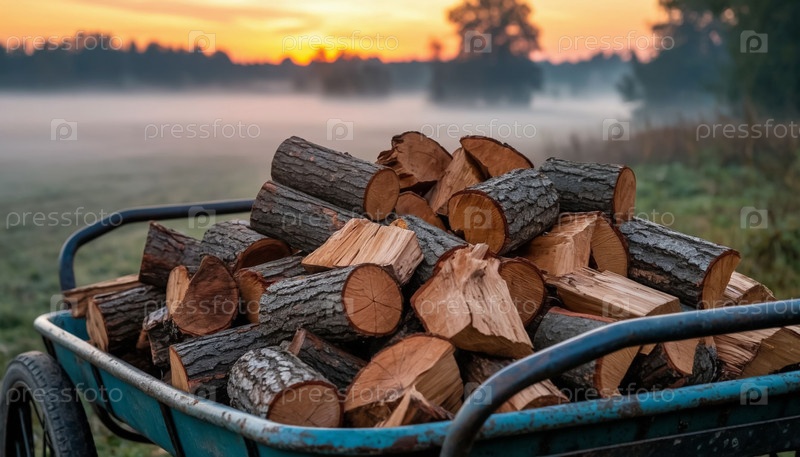 Древесина в тележке на поле, вечерний туман и закат солнца